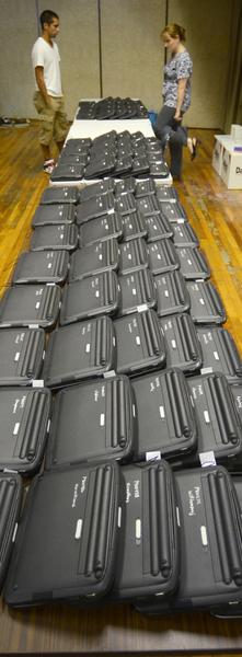 Tribune-Star/Jim Avelis Ready to go: Dozens of new laptop computers await Riverton-Parke juniors Wednesday afternoon. The PC based computers paid for through textbook rental fees are designed to help the school district switch its curriculum to a digital format.