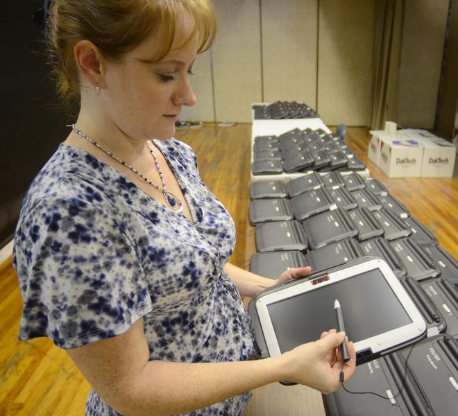 g000258000000000000f80daaed5eb5bd1137c863c03e566c1588707640 Published March 3, 2013 at 660 × 600 in Hot Off The Press Tribune-Star/Jim Avelis Convertible: Riverton-Parke’s Rachel Porter demonstrates the versatility of the new laptops the students will be using this school year.